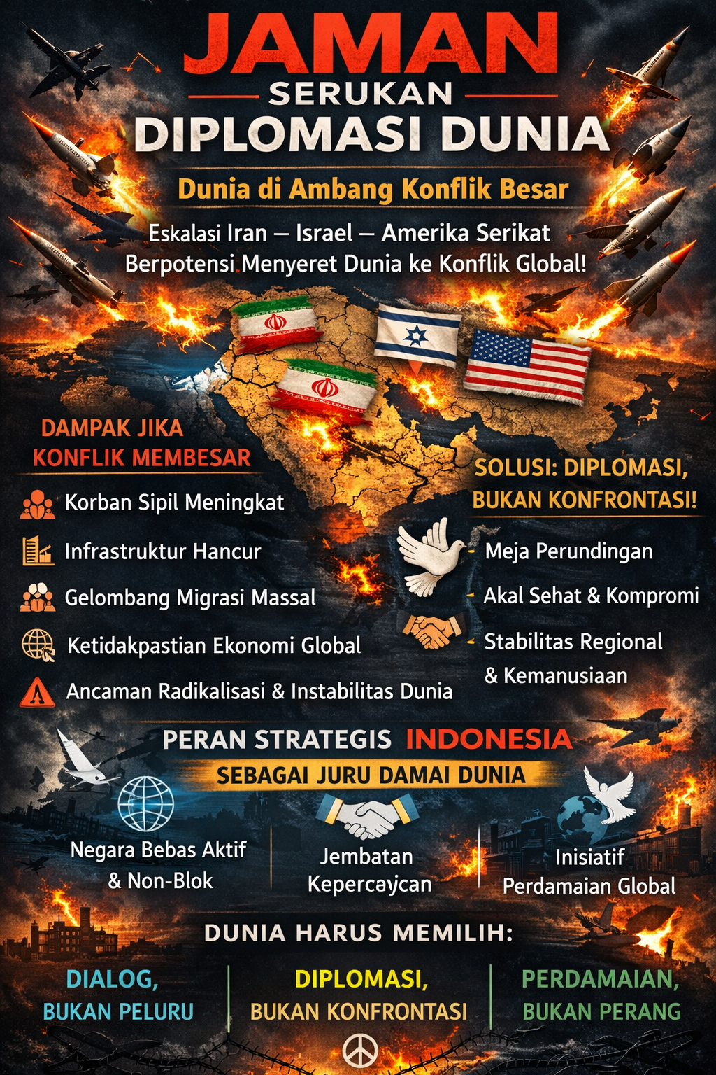 A. Iwan Dwi Laksono, SE, menyoroti bahwa eskalasi terbaru, yang ditandai dengan serangan balasan langsung antara Iran dan Israel, serta peran kompleks Amerika Serikat dalam dinamika regional, telah menyeret kawasan dan dunia ke ambang jurang konflik yang lebih luas. Ketua Umum JAMAN ini menegaskan bahwa ini bukan lagi sekadar perang proksi, melainkan manifestasi nyata dari ketegangan geopolitik yang membutuhkan intervensi strategis dan diplomasi yang cerdas dan presisi.