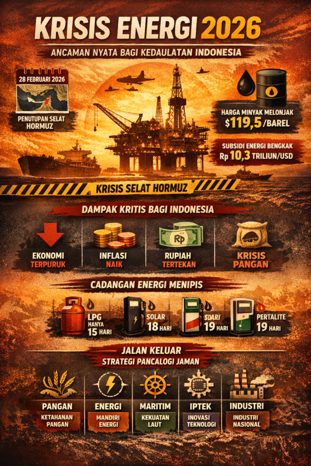 Jamaninfo.com, Rilis – Indonesia kembali dihadapkan pada ujian besar dalam sektor energi. Penutupan Selat Hormuz pada 28 Februari 2026 akibat konflik geopolitik global menjadi titik balik yang memperlihatkan secara nyata rapuhnya ketahanan energi nasional. Ketergantungan tinggi terhadap impor energi fosil kini bukan lagi sekadar isu ekonomi, melainkan telah menjelma menjadi ancaman eksistensial bagi keberlanjutan bangsa.