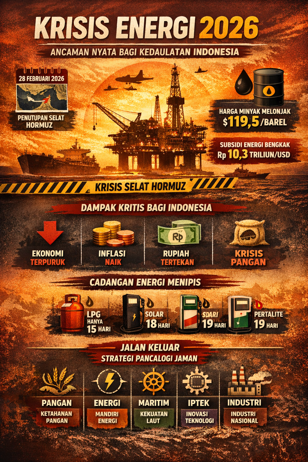 Kondisi ini menempatkan Indonesia pada posisi sangat rentan terhadap gangguan pasokan global. Dalam skenario krisis berkepanjangan, kelangkaan energi dapat terjadi dalam hitungan minggu, bukan bulan.